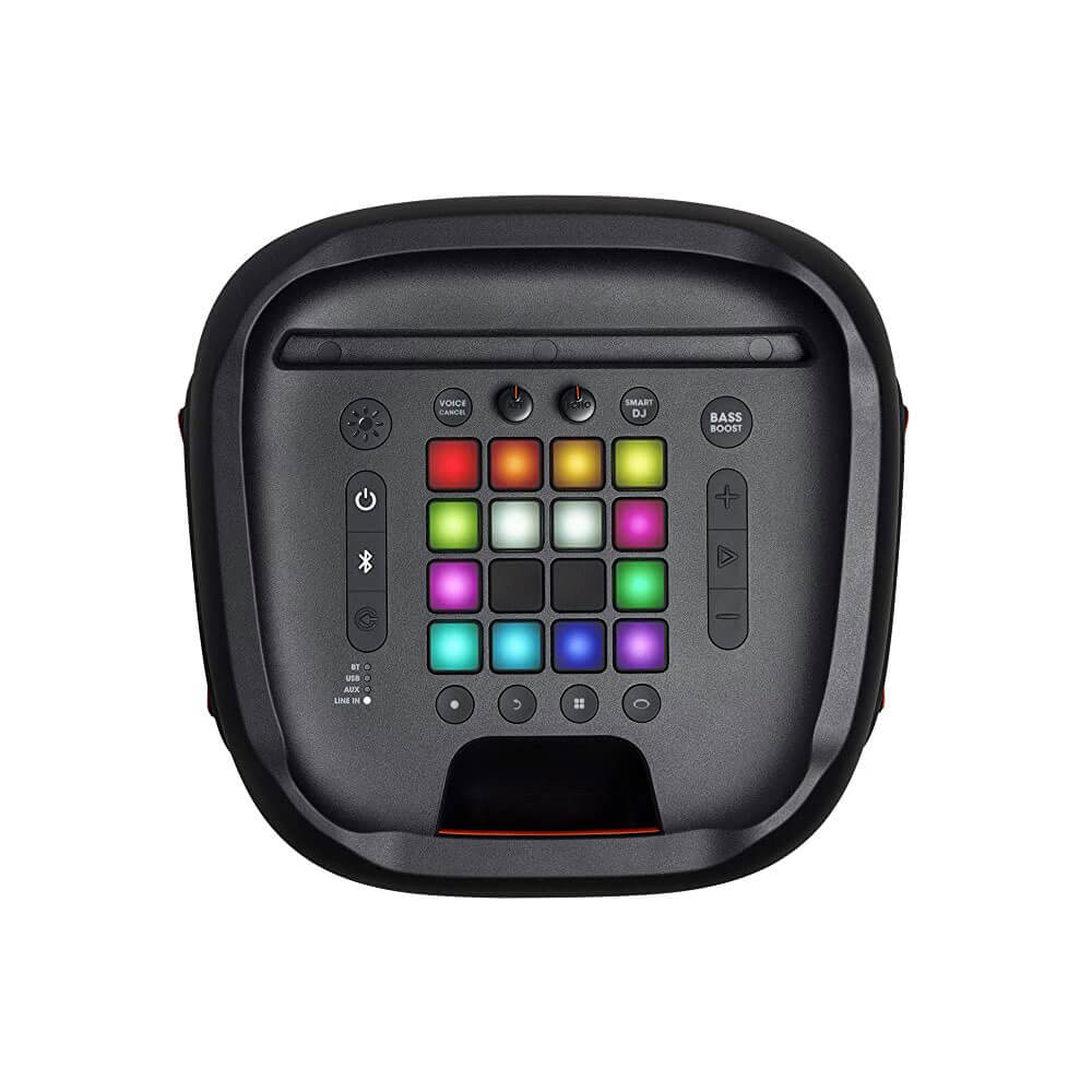 اسپیکر حرفه ای ۱۱۰۰ وات همراه با پد DJ دارای پد DJ با قابلیت نواختن درام، کیبورد و پیانو دارای قابلیت Smart DJ دارای ورودی گیتار و میکروفون یک ووفر ۳۰۴.۸ میلی متری و ۲ میدووفر ۱۷۷.۸ میلی متری تکنولوژی Bass Boost برای کنترل باس اسپیکر LED رقص نور با قابلیت تنظیم با ریتم موسیقی در تمام پنل جلویی اسپیکر یک پورت USB برای پخش موزیک دستبند Air Gesture با LED هماهنگ با اسپیکر قابلیت تغییر افکت صدا و رقص نور توسط دستبند قابلیت کارائوکه نوع اتصال بی سیم از طریق بلوتوث و با سیم از طریق AUX دارای خروجی هدفون و ورودی میکروفون نسخه بلوتوث ۴.۲ دارای ورودی صدا دارای یک ووفر ۳۰.۴۸ سانتی متری و ۲ میدووفر ۱۷.۷۸ سانتی متری دارای میکروفون داخلی قابلیت شارژ دستگاه های مختلف از طریق پورت USB پورت ورودی صدا استریو ۲RCA پورت ورودی AUX پورت خروجی ۳.۵ میلی متری صدا پورت خروجی ۳.۵ میلی متری صدا و دیتا دارای ۲ چرخ زیر اسپیکر برای جابجایی راحت تر میباشد.