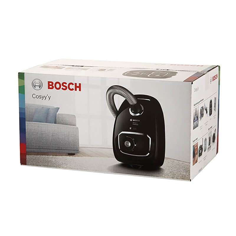 جاروبرقی بوش BGLS42230 یا 42230 رنگ مشکی یکی از جاروبرقی های سری 4 بوش محسوب می شود که در سال 2018 معرفی و روانه بازار شده است. این محصول با مدل جاروبرقی بوش Cosyy’y نیز در بازار شناخته می شود. جاروبرقی Bosch Cosyy’y BGLS42230 با توجه به مشخصات و ویژگی هایی که دارد برای جارو کردن سطوح صاف، سطوح سخت، شکاف ها، مبلمان و پرده ها گزینه کاملا مناسبی است. این جارو برقی دارای حداکثر قدرت و توان 2200 وات است و قدرت مکش خوبی دارد. متاسفانه بوش میزان قدرت مکش جاروبرقی مذکور را اعلام نکرده است. البته قدرت مکش این محصول قابلیت تنظیم در 5 سطح مختلف را دارد تا بسته به نیاز خود آن را انتخاب نمایید. برای این منظور تنها کافی است تا دکمه خاموش و روشن کردن دستگاه بر روی بدنه را به سمت مورد نظر بچرخانید. جاروبرقی 2200 وات بوش مدل BGLS42230 جزو جاروبرقی های کیسه ای به حساب می آید. این مدل مجهز به کیسه قابل تعویض از نوع G با ظرفیت XL معادل 4 لیتر است. این جاروبرقی از کیسه های نوع G ALL با سیستم PowerProtect پشتیبانی می کند. سیستم PowerProtect علاوه بر بهبود عملکرد و کارایی، به افزایش قدرت مکش و طول عمر جاروبرقی نیز کمک می کند. در نتیجه حتی هنگامی که کیسه جاروبرقی پر است هم شاهد قدرت مکش خوبی خواهید بود. کیسه های G ALL با توجه به طراحی چند لایه ای که دارند نسبت به کیسه های معمولی (پاکتی)، ظرفیت بیشتر و عملکرد بهتری دارند . جاروبرقی 2018 بوش BGLS42230 مجهز به موتور قدرتمند HiSpin می باشد. موتور مذکور دارای طراحی آیرودینامیک است که نسبت به موتور های معمولی عملکرد بهتر، مصرف انرژی کمتر و طول عمر بالاتر دارد. بوش این موتور را تا 10 سال ضمانت کرده است که نشان دهنده عملکرد و کیفیت بسیار بالای آن می باشد. این مدل به لطف بهره مندی از فیلتر هپا (HEPA) می تواند ذرات ریز گرد و غبار را قبل از خروج از جاروبرقی جذب نماید. به لطف فیلتر مذکور هوای خروجی از جارو برقی تمیز تر می باشد که همین موضوع نیز این محصول را برای افراد آلرژیک گزینه مناسبی نموده است. البته جاروبرقی بوش مدل  42230 مجهز به فیلتر Motor Protection قبل از موتور می باشد تا هوای ورودی به موتور را تا حدی تصفیه نماید. هر 2 فیلتر نام برده شده قابلیت شستشو دارند و می توانید چندین بار از آنها استفاده کرده تا هزینه هایتان کاهش یابد. توجه نمایید که جاروبرقی مذکور برای تمیز کردن مایعات طراحی نشده است و در صورت جمع آوری مایعات ممکن است به آن آسیب وارد شود. جاروبرقی کیسه ای بوش BGLS42230 دارای نشانگر تعویض کیسه (Dust Bag Change indicator) است و زمانی که این نشانگر پر شود باید کیسه جاروبرقی را تعویض نمایید یا ممکن است ورودی هوای جاروبرقی مسدود شده باشد. هرگز بدون کیسه یا حتی فیلتر قبل موتور و فیلتر هپا از جاروبرقی استفاده نکنید. جارو برقی بوش BGLS42230 دارای نازل اصلی با قابلیت تنظیم در 2 حالت است تا بتوانید سطوح صاف ( مانند فرش) و کف زمین را به خوبی با آن جارو نمایید. علاوه بر این، در بسته بندی آن نازل سطوح سخت با مدل BBZ123HD نیز وجود دارد تا به کمک آن بتوانید سطوحی مثل پارکت، موزاییک و سرامیک را جارو کنید. این مدل مجهز به نازل دو کاره (2 در 1) می باشد که برای تمیز نمودن بهتر شکاف و درز ها، مبلمان و پرده مورد استفاده قرار می گیرد. همچنین می توانید این نازل را به کمک گیره موجود در بسته بندی، به لوله جاروبرقی متصل نمایید تا به آسانی در دسترس شما باشد. جاروبرقی Bosch BGLS42230 دارای دسته آرگونومیک (Ergo Grip Handle) است تا هنگام کار با آن کمتر خسته شوید. لوله جارو برقی مذکور از نوع تلسکوپی است و قابلیت تنظیم ارتفاع دارد. این لوله تسکوپی از جنس فلز ساخته شده و نشان دهنده کیفیت ساخت بالای این محصول است. همچنین لوله خرطومی از نوع کنفی و بافته شده (Textile Hose) دارد که نشان دهنده کیفیت و دوام بالای آن است. این جارو برقی مجهز به 4 چرخ کوچک نرم است که به خوبی روی سطوح مختلف حرکت نموده و خط و خش ایجاد نمی کند. در جلوی این مدل دستگیره ای جهت حمل و نقل جاروبرقی طراحی شده است. این محصول دارای سیم برقی به طول تقریبی 7 متر و شعاع عم