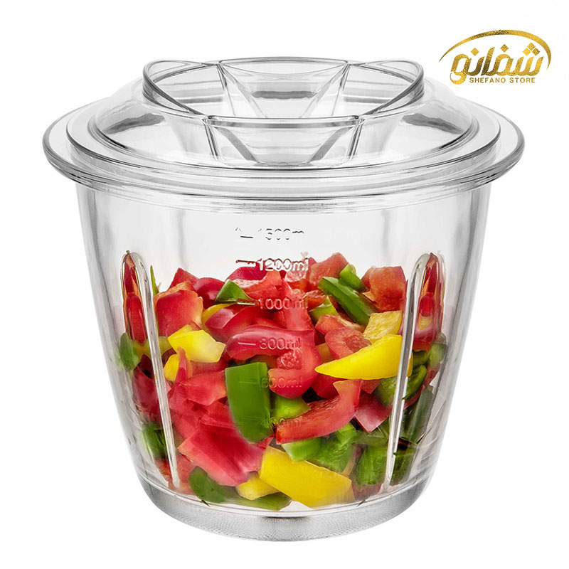 ظرفی که سنکور برای این خردکن در نظر گرفته است نیز خاص است. جنس این ظرف شیشه بوده و دارای گنجایش ۱.۵ لیتری است. ظرف محصول همچنین مدرج بوده و به شما امکان اطلاع از حجم محتویات را می بخشد. برای شستشو هم می توانید آن را درون ماشین ظرفشویی بگذارید. یک دیسک پلاستیکی هم در کنار ظرف قرار گرفته است که میتوانید از آن برای جلوگیری از لیز خوردن خردکن استفاده کنید. از این خردکن می توانید برای تهیه انواع پوره و سس استفاده کنید.